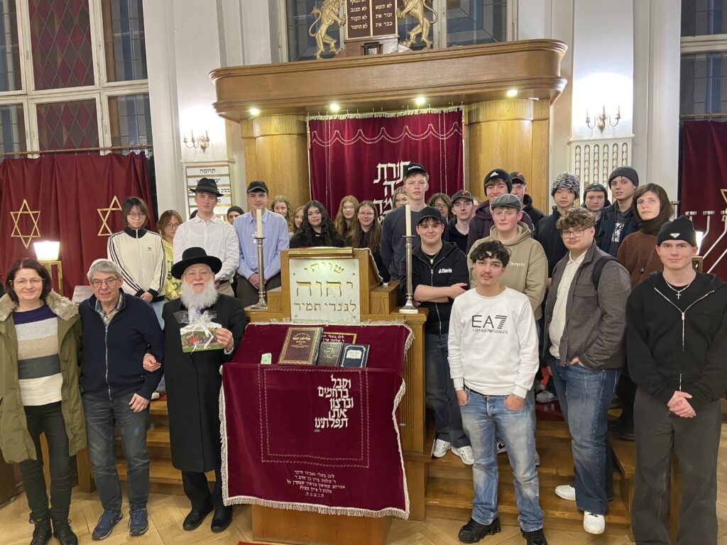 Am Montag, dem 16. Februar, traf die Gruppe nach der Zugfahrt aus Bad Laasphe in ihrem Hostel nahe des Berliner Hauptbahnhofs ein. Kurz darauf machten sich alle auf den Weg zum Gottesdienst der jüdisch-orthodoxen Gemeinde in der Nähe des Kurfürstendamms. Die Schule pflegt seit über 15 Jahren einen freundschaftlichen Kontakt zu Rabbiner Ehrenberg, der auch in diesem Jahr zentrale Inhalte des Judentums erläuterte. Er betonte, dass der Mensch als Geschöpf Gottes gehalten ist, in Frieden mit seinen Mitmenschen zu leben – unabhängig von Herkunft oder Religion. Viele Schülerinnen und Schüler hatten Fragen zum Ablauf des Gottesdienstes, da ihnen manches ungewohnt erschien. Rabbiner Ehrenberg erklärte geduldig, warum beim Beten mit dem Oberkörper gewippt wird, weshalb Männer eine Kopfbedeckung tragen und warum Frauen getrennt von den Männern sitzen. Die bei diesem Besuch gewonnenen Eindrücke konnten die Schülerinnen und Schüler am Mittwochnachmittag im Jüdischen Museum vertiefen.
